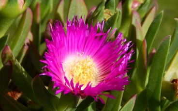 Carpobrotus is a genus of succulent plants in the family Aizoaceae. This genus includes around 12 to 20 species and is native to South Africa. Plants of the genus Carpobrotus are known for their ability to spread rapidly and form dense mats that can cover large areas. Due to their drought tolerance, they are often used as ground cover in dry and sandy regions. The plants have fleshy leaves and showy flowers that appear in various colors, including pink, purple, yellow, and white. The fruits of Carpobrotus are edible and have been traditionally used in South Africa to make jams.