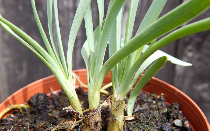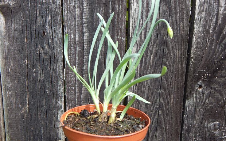 Tvoří husté trsy úzkých, šedozelených až modrozelených listů. Ty se mírně vlní a získávají protáhlé úzké tvary růstu. Rostlina představuje typickou cibulovinu.