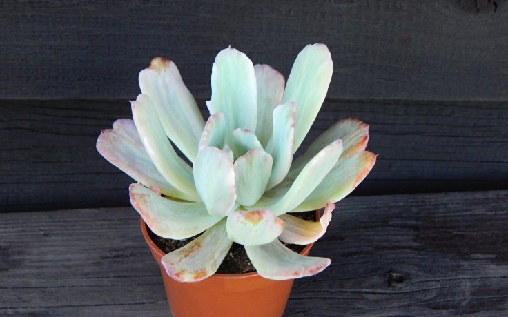 Nenápadně panašované listy se barví do světle zelené a lemují je široké růžové či bílé, lehce zvlněné okraje. Listy dorůstají 5-10 cm na délku a 2-2,5 cm na šířku. Jednotlivé listy vyrůstají v růžici o průměru 15-20 cm. Rostlina občas odnožuje a obvykle vyrůstá s přízemním stonkem, ačkoli ve stáří krátký stonek může mírně povyrůst.