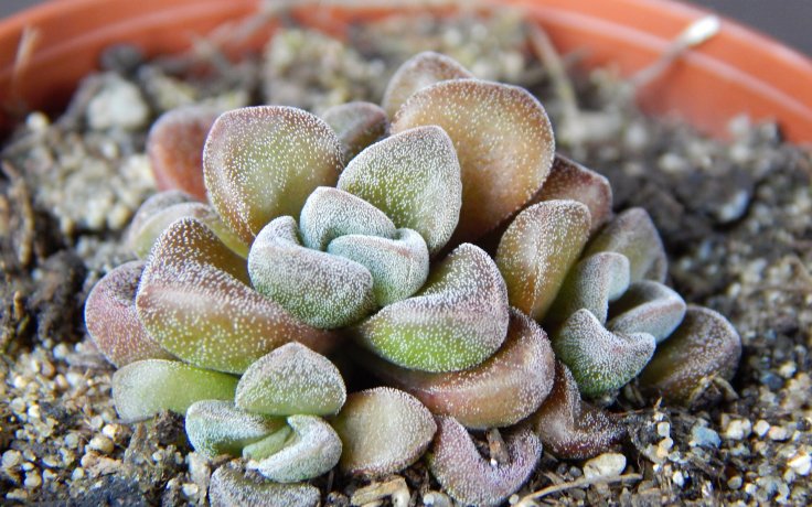 It has light grey-green leaves with many whitish papillae and a purple tinge that intensifies in light and dry conditions. The leaves tend to be small, thick, fleshy, triangular in shape and slightly concave. The rosettes of the plant readily form lateral offshoots, forming small clumps. The whole clump grows permanently low to the ground.
