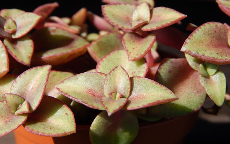 It features beautiful purplish pink leaves that are edged in red and sometimes with a hint of yellow or green. The colour of the leaves can change depending on the amount of light and watering. For example, they take on a redder to blacker colour with more sun exposure. The fleshy, heart-shaped leaves grow in pairs on interlacing or twining branches. The plant usually grows to a height of 15 cm.