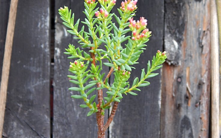 In June, flower buds appear at the top of the branches. A month later, the burgundy-red buds open into tiny flowers of a soft pinkish colour. The plant is at its most beautiful just before the flowers open, when it is enveloped in the full glory of the buds. The flowers have a pleasant sweet fruity scent. It is advisable to remove the dried inflorescences after flowering.