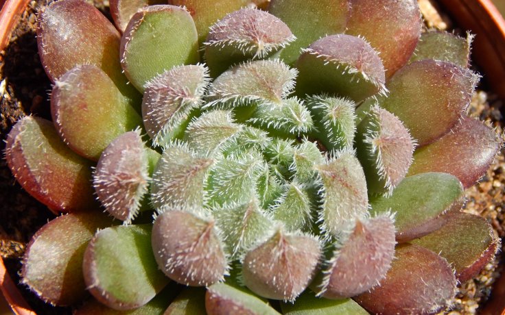 This Echeveria is characterised by its fleshy lanceolate leaves, which turn blue-green and tend to be flat at the top. The undersides of the leaves are rounded and can vary in colour from red to purple or even blackish. The leaves are covered with small whitish hairs that protect the plant from intense sunlight. It has a compact growth habit and grows in the classic solitary rosette shape. Over time, however, it branches off from the bottom to form a cluster of rosettes. The diameter of the ground rosette is usually around 5 cm.
