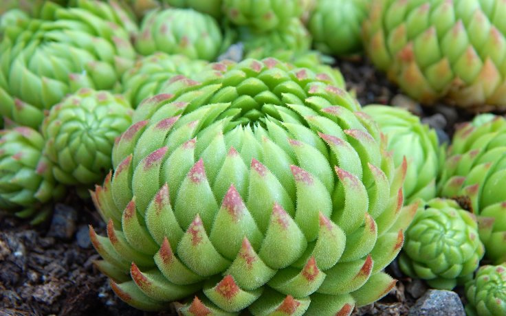 The frost-hardy Jovibarba hirta Green Gold was created by crossing unknown species in 2002 in Belgium. The name Green Gold refers to the bright green colouring that distinguishes it. During the summer it turns even more golden. The densely hairy leaves grow in the shape of balls. These are formed by the dense growth of concentric rosettes that retract into their centre. The leaves turn from green to golden and their tips turn slightly red in the sun. The plant branches profusely and quickly covers vacant spaces in its surroundings. This makes it perfect for modern rock gardens that we want to cover with lush greenery.