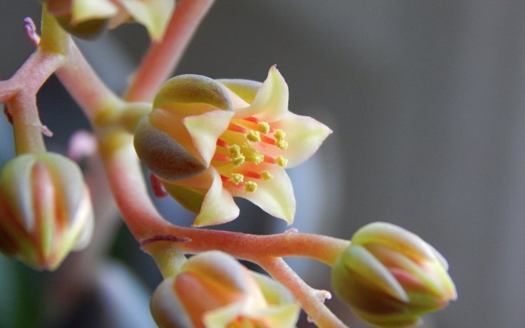 In addition to its attractive foliage, Sedeveria Blue Mist can also impress with its beautiful flowers. These appear in summer on upright, much branched stems that grow up to 15 cm tall. The bell-shaped flowers turn orange, pink or beige.