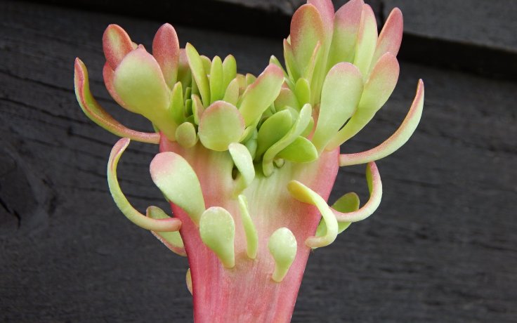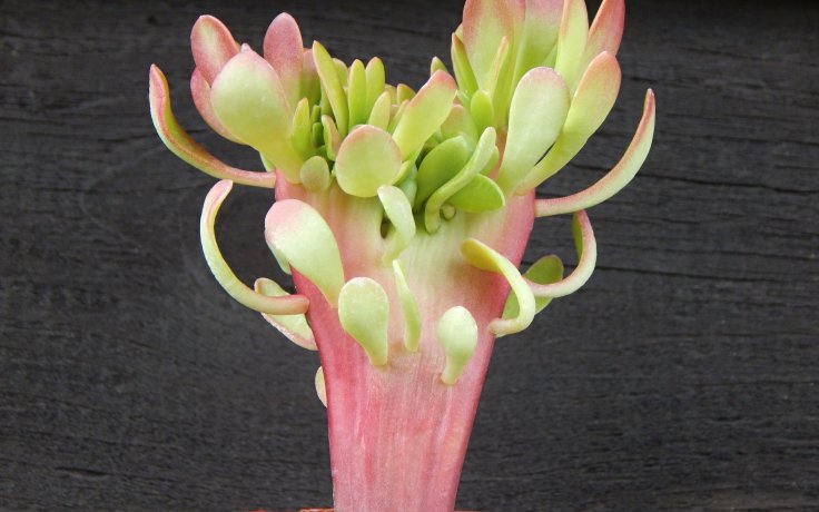 The shiny surface of the leaves is glossy and turns a light green colour. In full sun, the edges of the leaves turn pink to red. The sun also causes the leaves to grow smaller and more crowded together. The old leaves dry naturally to form a stem. This is flat, thin and often covered with aerial roots. In mid-summer it takes on a pinkish tinge, which is especially noticeable on younger plants. The tall cyme forms very quickly, which is not typical of similar cristate forms.