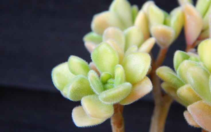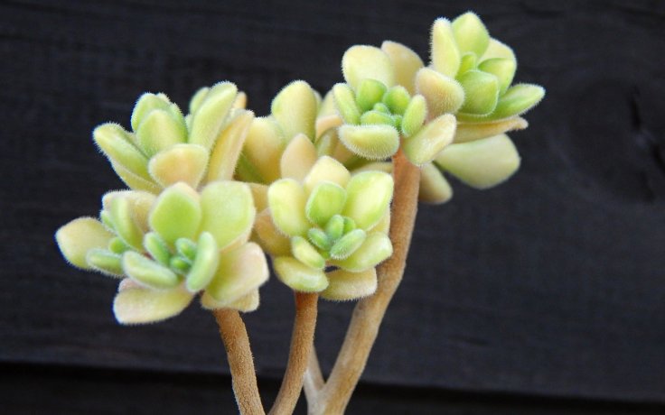 Listy se barví do tmavších barev a získávají bledší odstíny než původní forma. Převládá limetková, ale objevuje se i krémová, růžová či žlutozelená. Během roku se zbarvení mění a mírně odlišuje. Listy pokrývají jemné chloupky, čímž jim dodávají sametovou texturu. Sukulent se hojně větví a vytváří drobné růžice s mělkým kořenovým systémem. V létě se mohou vyvinout i vzdušné kořeny.