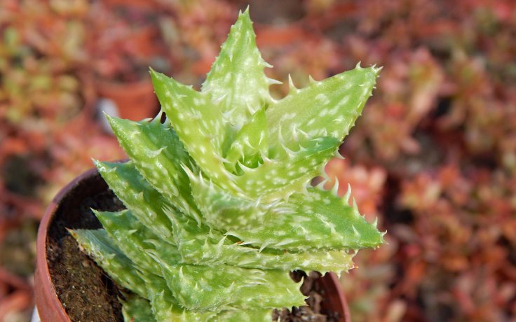 Tato sukulentní rostlina se vyznačuje pevnými listy, které rostou blízko u sebe a bývají pokryty mnoha bílými skvrnami. Měkké ostny bílé barvy se nacházejí po okrajích listů, a od spodu rostliny vyrůstají odnože, což vytváří charakteristické trsy. Rostlina obvykle dosahuje výšky do 30 cm.
