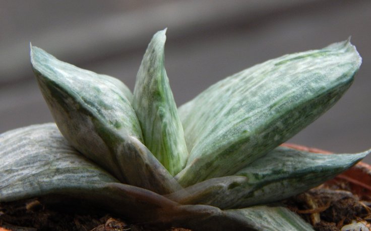 Tyto listy bývají zelené s bílými a šedými skvrnami a s růžovými tóny, které se v závislosti na světle a teplotě mění. Špičky listů s hřebeny dodávají rostlině mohutný až monstrózní vzhled. Gasteria roste pomalu a volně vytváří odnože, které časem tvoří hustý trs. Dorůstá výšky až 15 cm.