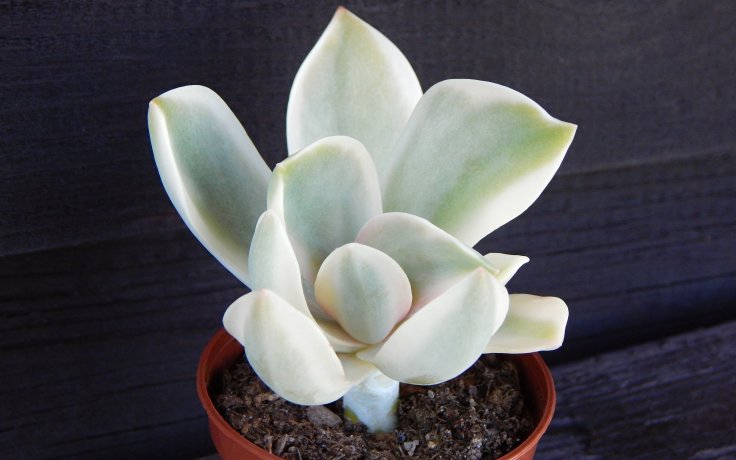 Panašované, voskovité listy se barví do odstínů zelené, žluté a bílé barvy. Tvoří růžice, které mohou dorůstat až 30 cm v průměru. Díky pevnému kmínku vyrůstá do výšky až 20 cm a celá rostlina mění svou podobu během roku.