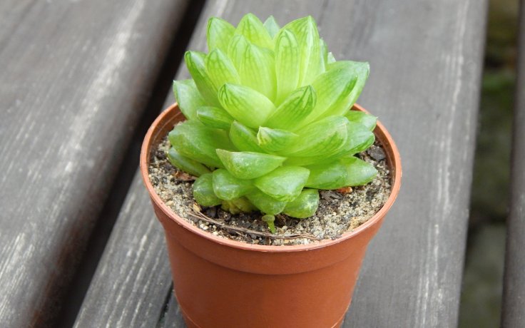 Haworthia cymbiformis var. obtusa, pomalu rostoucí drobný sukulent, kvete od jara do léta. Bílé až zelenobílé květy s růžovohnědými žilkami se objevují na štíhlých květenstvích dosahujících výšky až 20 cm.